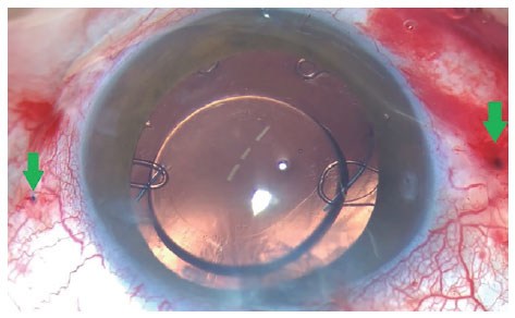 Also important is the shape of the tunnel and the length of the external segment of the polypropylene. The surgeon needs to create a long and well-angulated tunnel, because if the needle is inserted directly into the sclera, the tunnel will be short, and insertion of the second flange inside the tunnel will thus be more difficult. The length of the external segment of the polypropylene needs to be approximately 2 mm; if the surgeon shortens the external end of the suture, the capsular bag can be tight. On the other hand, if the external polypropylene is too long, extrusion of the flange can occur, which occurred in one patient, and we had to intervene surgically to reduce the external length of the suture.