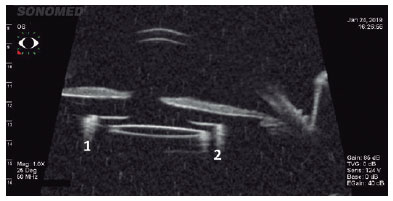 To replace the standard 10-0 monofilament, we chose a 5-0 polypropylene monofilament because it is thicker(19) and thus shows greater resistance to degradation and may reduce the risk of suture rupture. In addition, the 5-0 polypropylene monofilament is placed in the 26-gauge lumen and the needle guides the monofilament externally, which avoids the time-consuming and difficult maneuvers needed in the traditional approach to pass long needles in the anterior chamber using 10-0 polypropylene or 7-0 polytetrafluoroethylene sutures.