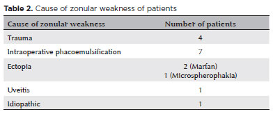 This prospective case series is composed of 17 eyes of 17 patients with zonular dialysis >120o who required IOL implantation in the setting of zonular dialysis due to trauma (six eyes), Marfan syndrome (three eyes), microspherophakia (two eyes), idiopathic disease (two eyes), post-phacoemulsification status (four eyes), or eyes that have previously undergone cataract surgery and that evolved with IOL bag dislocation, thus requiring a second surgery for IOL implantation and bag centration (see Tables 1 and 2 for population characterization). In patients with zonular dialysis >180o, such as those with microspherophakia, we used two CTSs to fixate the capsular bag.