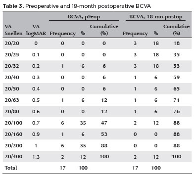 Measurement of visual acuity was recorded in Snellen and then converted to logMAR for statistical analysis. Follow-up was scheduled at 1, 3, 6, 12, and 18 months. We report the results at 18 months postoperatively.