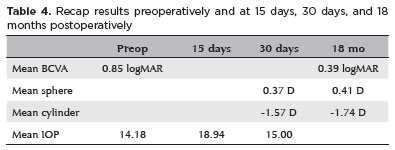 There was a statistically significant difference in visual acuity between the preoperative and 18-month visits. Preoperatively, 12% of the eyes had a BCVA equal to or better than 20/80 Snellen; 18 months postoperatively, 78% had a BCVA better than or equal to 20/80 Snellen (Table 3). Overall, the BCVA improved significantly (p=0.001) from 0.85 (SD 0.28) to 0.39 (SD 0.41) (logMAR). The spherical error passed from 0.37 D (SD 0.88) at 30 days to 0.41 D (SD 0.85) at 18 months postoperatively. This is considered stable, as the paired t test showed no change (p=0.698). The cylindrical error remained stable from -1.57 D (SD 1.23) at 30 days postoperatively to -1.74 D (SD 1.29) at 18 months postoperatively. The paired t test showed no difference (p=0.069).