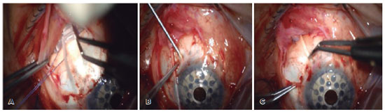 Modes of management in recalcitrant cases included implantation of a GDD (Ahmed® Glaucoma Valve, New World Medical, Inc., CA, USA) before, concurrently, or after Kpro surgery (Figure 1 A-C) or transscleral cyclophotocoagulation (CPC) after Kpro surgery.