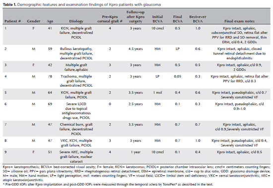 Conclusões: Nesta coorte, os olhos com glaucoma pré-existente foram mais difíceis de manejar, comparados àqueles que desenvolveram glaucoma após a cirurgia de ceratoprótese. Apareceram mais complicações retinianas quando o implante do dispositivo de drenagem de glaucoma foi realizado no máximo 6 meses antes da cirurgia de ceratoprótese do tipo afácico com vitrectomia parcial.