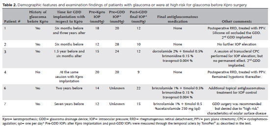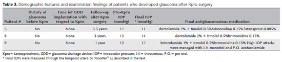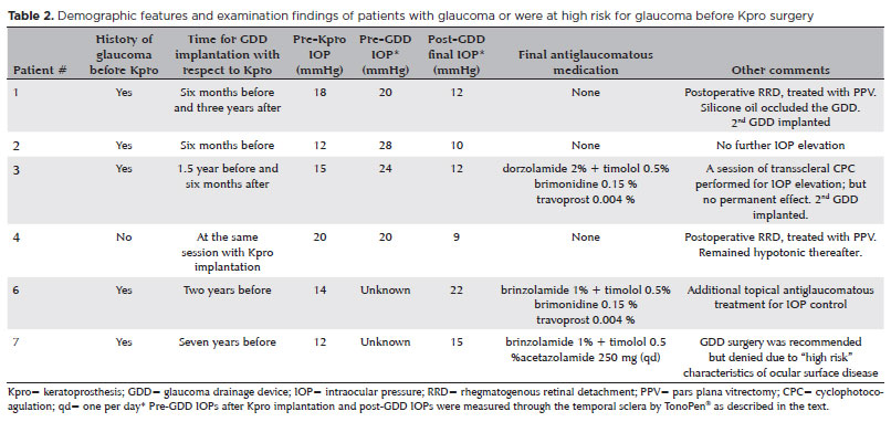 Topical antiglaucomatous medications are less effective in eyes with a Kpro due to the reduced ocular surface available for eye drop absorption. Systemic carbonic anhydrase inhibitors were proposed when additional pharmacological therapy is necessary(4). Two of our cases (patients 7 and 9) have been long under oral acetazolamide treatment without side effects.