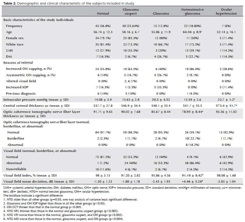 Resultados: Um total de 135 pacientes foram incluídos neste estudo, sendo que destes, 117 pacientes completaram todos os exames e foram incluídos neste estudo. A maioria dos pacientes foi considerada normal (36,8%), seguido por glaucoma suspeito (25,64%), glaucoma de pressão normal (18,8%), glaucoma com pressão intraocular elevada (12%) e hipertensão ocular (6%). A principal razão para encaminhamento foi escavação do nervo óptico aumentada. Pacientes com glaucoma de pressão normal eram em média mais velhos que os demais (p=0,03). Esses também apresentavam índice de campo visual e desvio médio da campimetria visual piores que sujeitos normal, com suspeita de glaucoma e hipertensos oculares, e tinham a camada de fibra nervosa medida pela tomografia de coerência óptica mais fina que normais e suspeitos de glaucoma (p<0,002). Os pacientes com glaucoma de pressão elevada não diferiram significativamente dos outros grupos.