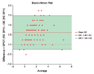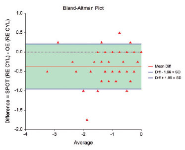 The Bland-Altman plot (difference versus mean) was used to compare the objective measurements obtained using the Spot Vision Screener with those obtained at retinoscopy. A smaller interval between the limits may be interpreted as better agreement, although the question of how small it should be depends on the clinical context(20). The overall vertical dispersion of the points scatter reflects how closely the two measures agree, considering that for measures in perfect agreement, the plot would lie along the horizontal axis(21).