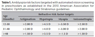 Amblyopia is the most common avoidable cause of vision loss in children, with a childhood prevalence of around 2%(1-3). The prevalence of risk factors, such as high ametropia, anisometropia, and strabismus, is even higher, reaching as many as 15-20%(4-6). Amblyopia is considered treatable up to 5 years of age, with a decline in the effectiveness of treatment after that(7). Identifying these risk factors early represents a major challenge in primary healthcare settings(8).