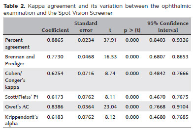 Seventeen of the 185 children (9.2%) had strabismus. There was 100% agreement between the Spot Vision Screener and ophthalmological examination for strabismus. Regarding the risk factors for amblyopia, table 2 shows the agreement between ophthalmological examination and the Spot Vision Screener and different ways of calculating the kappa. The agreement was almost perfect according to two calculation methods and substantial according to four, with the remaining alternative agreement coefficients showing substantial agreement.