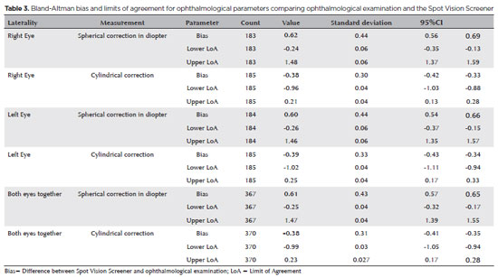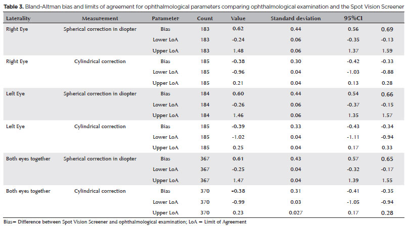 Table 3 shows the Bland-Altman bias and limits of agreement, with the bias ranging from 0.38 to 0.62. Ideally, values close to zero would indicate no bias between the Spot Vision Screener under cycloplegia and the ophthalmological examination. The device overestimated hyperopia or underestimated myopia by 0.62 D in the right eye (95%CI: 0.56-0.69) and by 0.60 D in the left eye (95%CI: 0.54-0.66). For cylindrical corrections, the device also overestimated values by -0.38 D in the right eye (95%CI: -0.42--0.33) and by -0.39 in the left eye (95%CI: -0.43--0.34). Regarding the overall spherical and cylindrical values, there was a difference of 0.61 D (95%CI: 0.57-0.65) and -0.38 D (95%CI: -0.41--0.35), respectively.