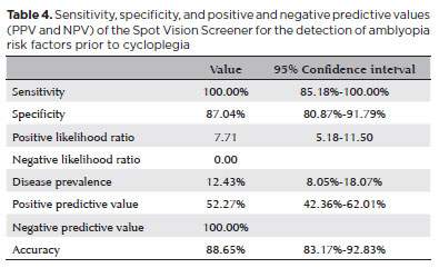Yakar compared the performance of the Spot Vision Screener prior to and following the induction of cycloplegia in 100 older children (3-10 years). Results showed a sensitivity of 60.9% and specificity of 94.9% without cycloplegia and sensitivity of 85.3% and specificity of 87.4% following the induction of cycloplegia. The positive and negative predictive values were 85.7% and 90.4%, respectively, without cycloplegia and 63.6% and 95.8%, respectively, following the induction of cycloplegia(16). Based on those results, the sensitivity of the screener was considered intermediate, and while specificity without cycloplegia was high, sensitivity increased significantly following the induction of cycloplegia(16). The same strategy was used in the present study to analyze the clinical performance of the Spot Vision Screener; however, in a younger age group (<3 years). Sensitivity and specificity without cycloplegia were 100% (95%CI: 85.18-100%) and 87.04% (95%CI: 80.87-91.79%), respectively, equivalent to the results found among children older than 3 years.