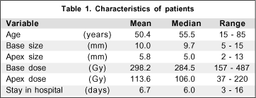 The differences in the size of the tumor base, apex, dose to the apex and treatment days were not statistically significant predictors of clinical outcome in this analysis (Table 2). The dose given to the tumor base was the most important factor to determine a favorable clinical outcome, but without statistical significance (p=0.075).