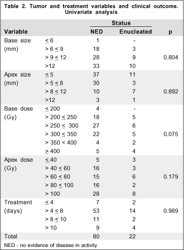 MÉTODOS: Foram avaliados 108 pacientes tratados consecutivamente de janeiro de 1995 a junho de 1999, com idade mediana de 55,5 anos, diâmetro da base do tumor e altura máximos 9,75 mm e 5 mm, respectivamente. As doses na base do tumor, incluindo 1 mm de esclera variaram de 157 a 487 Gy (mediana 284,5 Gy) e para o ápice de 37 até 220 Gy (mediana 106 Gy).