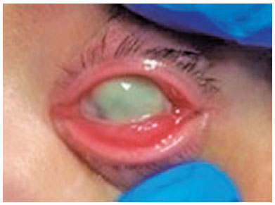 Corneal disease remains the leading cause of monocular blindness worldwide, especially affecting marginalized populations. Corneal opacities, which are largely caused by infectious keratitis, are the fourth leading cause of blindness globally and responsible for 10% of avoidable visual impairment in the world’s least developed countries(1). Herein, we report a case of aggressive infectious keratitis caused by Pseudomonas aeruginosa in an otherwise healthy 2-month-old infant with no previous risk factors of ocular infections, which led to corneal transplant.