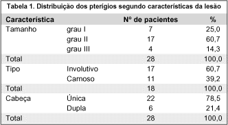 A maioria dos pterígios era do grau II (17 olhos - 60,7%), do tipo involutivo (17 olhos - 60,7%) e de cabeça única (22 olhos - 78,5%) (Tabela 1).