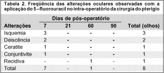 As alterações observadas no pós-operatório estão apresentadas na tabela 2. No 7º pós-operatório, observou-se persistência da isquemia na área de aplicação em 03 olhos (10,7%), deiscência de sutura conjuntival em 02 (7,1%), ceratite em 01 (3,5%) conjuntivite em 01 (3,5%). No 60º pós-operatório, não foram observadas alterações nos olhos operados, exceto 01 olho (3,5%) que apresentava recidiva da lesão conjuntival (paciente de 26 anos, portador de pterígio primário, grau I e do tipo involutivo).