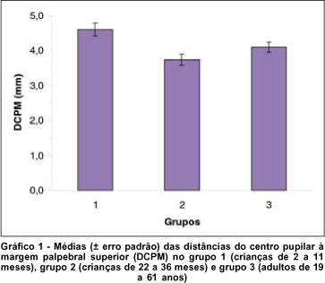 Os valores médios (± erro padrão) das distâncias do centro pupilar à margem palpebral superior no claro (condições fotópicas) foram: grupo 1, 4,61±0,18 mm; grupo 2, 3,74±0,16 mm e grupo 3, 4,10±0,15 mm. Análise de variância unifatorial para os três grupos mostrou que há diferenças entre os posicionamentos palpebrais superiores em condições fotópicas (F=7,16 e p=0,0015). A análise post hoc pelo teste de Tuckey revelou que a DCPM do grupo 1 é maior que a dos grupos 2 e 3, sendo que os dois últimos não diferem entre si (Gráfico 1).