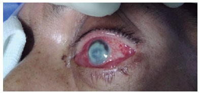 A 56-year-old man was admitted to the ICU due to severe COVID-19 pneumonia. Two months after the admission, the ophthalmology department was consulted for a recent “whitish” lesion in the left eye. Both eyes showed incomplete lid closure, predominantly in the left eye, accompanied by slight proptosis, edema, and erythema in both eyelids. The corneal ulcer presented as a whitish lesion of 9 x 9 mm with irregular borders and a ring-like stromal infiltrate, including the lower limbus. Seropurulent discharge in the conjunctival fornix and 2 mm hypopyon was seen (Figure 1). After the initial evaluation, fortified antibiotics of ceftazidime 50 mg/ml and vancomycin 50 mg/ml were administered every hour. Complementary images were requested, a brain and orbital computed tomography scan showed a slight increase in the volume of the preseptal tissues without hyperdense areas in the vitreous cavity of the left eye. Because of the patient’s hemodynamic instability, it was not possible to take a sample for a culture of the lesion at that moment.