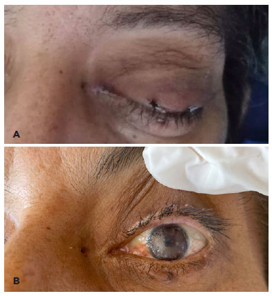 Due to the culture result, the rapid clinical evolution and the persistence of incomplete lid closure despite the marked decrease in soft tissue edema in the left eye, it was decided to perform a temporary tarsorrhaphy (Figure 2A), and prescribe topical colistin. Seven days after the first evaluation, topical colistin every 2 hours was initiated in the left eye.