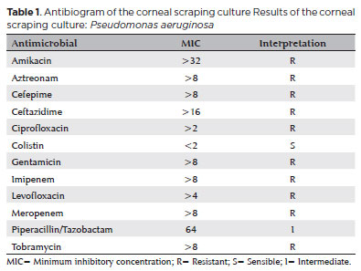 Four days after the initial evaluation, the corneal infiltrate did not show significant changes. Because of the improvement of the clinical status, corneal scarping cultures of the entire edge and base of the ulcer were taken. After 72 hours, the culture and antibiogram were positive for PA resistant to all antibiotics except colistin, with a minimum inhibitory concentration (MIC) of <2 (Table 1).
