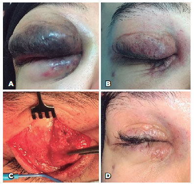 The presented case underwent surgical debulking of orbital LM twice during early childhood, which were not successful in alleviating neither the mass effect nor the disfigurement caused mainly by the eyelid component. ILBI was performed in multiple sessions but achieved only partial response due to the predominance of the microcystic variant of the lesion. Hence, surgical debulking was offered to improve the cosmetic shape of the eyelid. Although surgical intervention in LM is usually a bloody procedure, the fibrotic effect of ILBI made the surgical debulking much easier with minimal bleeding. However, the surgical planes were not identifiable because of the infiltrative and unencapsulated nature of LM(2). The lack of macrocystic variant and bleeding did not suggest the use of negative pressure after surgery, which was suggested to collapse the lymphatic cyst(6).