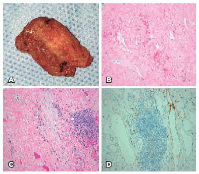 The excised tissue (Figure 2A) was sent for histopathological evaluation, which revealed residual orbital lymphangioma with focal dense lymphocytic infiltrate adjacent to the lymphangiomatous spaces, occluded blood vessels, and fibrosis. Most of the histological sections showed extensive fibrosis and only few residual narrow vascular spaces lined by endothelial cells highlighted by the expression of staining to the immunohistochemical (IHC) marker for the lymphatic endothelium (podoplanin; Figure 2B-D).