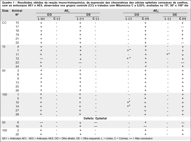 Os resultados obtidos das reações dos anticorpos monoclonais AE1 e AE5 com as expressões de citoceratinas do epitélio corneano de coelhos, nas regiões do limbo e central, não revelaram alterações no padrão de diferenciação celular com uso tópico de MMC a 0,02%, em superfície ocular íntegra (Quadro 1) - o que coincide com os achados na literatura(12).