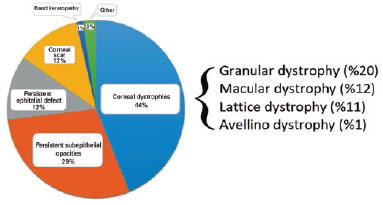 PTK was most often applied for corneal stromal dystrophies (44%, 151 eyes from 111 patients), and granular dystrophy was the most common PTK indication among corneal dystrophies. The etiological distribution of the cases included in the present study is given in figure 1.