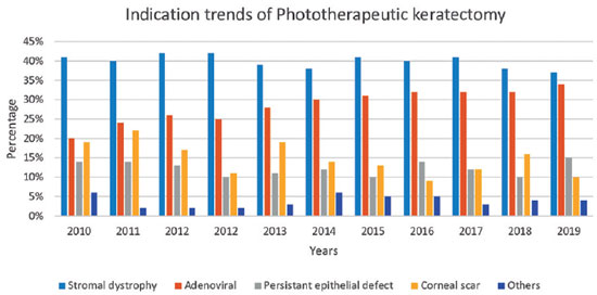 Unlike other indications, there has been an increase in the application of PTK for persistent subepithelial opacities due to adenoviral conjunctivitis in the past 10 years. Figure 2 shows the changes in the indications for PTK from 2010 to 2019.