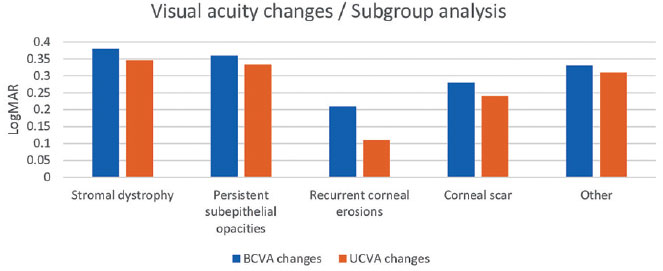 The preoperative mean spherical equivalent was-0.28 ± 3.13 diopters (D), and the postoperative spherical equivalent was 0.79 ± 3.63 D at the end of the follow-up. The change in visual acuity of all patients before and after the procedure is given in figure 3. There was a significant increase in visual acuity in all groups except for the recurrent epithelial defect group (p<0.05). The greatest improvement in visual acuity was detected for stromal dystrophies in the granular dystrophy subgroup.