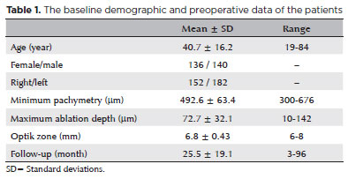 The baseline demographic and preoperative data of 334 eyes from 276 patients are given in table 1. The mean age of the patients was 40.7 ± 16.2 years (range: 19-84). The mean follow-up was 25.5 ± 19.1 months (range: 3-96).