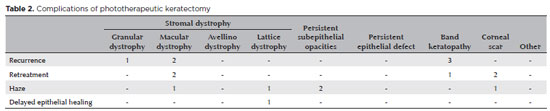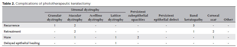 Depending on the underlying pathology, recurrence rates and patterns may vary after excimer laser ablation. Many studies analyzed various dystrophies relapse rates and models(30). Our study observed recurrence in 3 (0.9%) eyes: one with granular dystrophy and two with macular dystrophy. No recurrence was observed in patients with persistent subepithelial opacities.