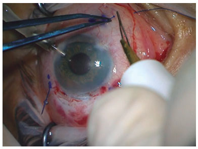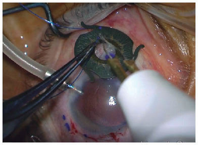 A 38-year-old female patient complained of vision loss and a cosmetic problem in her left eye. She had a penetrating trauma when she was 4 years old. Corneal haze, aniridia, aphakia, and exotropia were observed, and corrected distance visual acuity was 2/10 in her left eye and central corneal thickness was 582 μM. There was no apparent pathology on the fundus examination. Scleral fixation of the artificial iris-IOL complex (Reper®, Model C) was planned to the left eye using the Canabarava Double-Flanged Technique. This artificial iris-IOL complex has a 3.5-mm pupillary aperture with a 13-mm overall diameter and is made from a hydrophobic acrylic material(4). The iris color that will match the color of the patient’s other eye was selected from the color match catalog. At the start of the operation, the sclerotomy sides were marked on the conjunctiva 2 mm apart from the limbus. The intrascleral length of the tunnel was about 2 mm. A beveled and long intrascleral tunnel is important to avoid the risk of endophthalmitis and is a very critical point to minimize the risk of decentration or tilt(5). To fixate this foldable iris-IOL complex by using the double-flanged technique, we needed to perform a 5.2-mm posteriolimbal incision and a self-sealing tunnel using a crescent knife. To prevent hypotony anterior chamber maintainer is introduced. The 5-0 polypropylene suture end was passed through the first eyelet of a Reper iris-IOL complex and heated by the thermocautery to create the first flange (Figure 1). This was repeated for the other 2 eyelets. Then, as an external guide, a 27 gauge hypodermic needle was used to perform transconjunctival sclerectomy. This needle entered the anterior chamber and by the help of forceps and 25G microforceps the other part of the suture was pushed into the inner cavity of the needle (Figure 2). The suture was withdrawn from the sclerotomy side and this was repeated with other sutures of the eyelets. The iris-IOL complex was folded and introduced into the anterior chamber (Figure 3). The complex was centered by pulling the suture ends externalized 2 mm from the limbus at each side. The sutures were cut 2 mm from their base and heated to the last final second flanges (Figure 4), which would be inserted into the scleral tunnel. After the operation, the uncorrected distance visual acuity of the left eye increased to 5/10 at the 6-month postoperative period and the intraocular pressure was 14 mmHg.