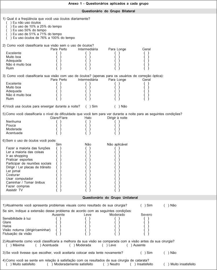 Utilizou-se um questionário específico e adaptado para avaliação da qualidade de vida e função visual de pacientes pseudofácicos, e que fora aplicado após um ano da cirurgia. O questionário englobava questões ligadas à satisfação do paciente na execução de atividades habituais e suas respectivas relações com as visões para longe, intermediária e perto. Além disso, também constavam questões referentes à qualidade da visão noturna e necessidade do uso de óculos (Anexo 1).