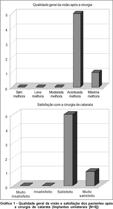 Os pacientes com implante monocular responderam questões relacionadas à satisfação com a cirurgia e à qualidade geral da visão (Gráfico 1). Dos pacientes entrevistados, 5 (83,3%) declararam melhora acentuada da visão, e 1 (16,7%) melhora total. Quanto ao nível de satisfação, 5 (83,3%) ficaram satisfeitos e 1 (16,7%) ficou muito satisfeito com o resultado da cirurgia. Considerando a visão noturna, 3 pacientes (50,0%) declararam que não tiveram dificuldade com a visão no período noturno, 2 pacientes (33,3%) apresentaram pouca dificuldade e 1 (16,7%) dificuldade moderada (Gráfico 2). Além disso, 3 pacientes (50%) do grupo unilateral, referiram ausência de problemas visuais como resultado da cirurgia e 3 (50%) referiram que apresentam alguma dificuldade na visão noturna (Gráfico 2). Todos os pacientes desse grupo se tivessem a oportunidade de escolher, aceitariam colocar a lente desse estudo novamente.