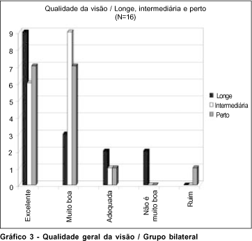 Das entrevistas realizadas com o grupo bilateral, 7 pacientes (43,8%) consideraram excelente a qualidade da visão para perto, 7 (43,8%) classificaram como muito boa, 1 (6,2%) considerou adequada e 1 (6,2%) classificou-a como ruim. A visão intermediária foi classificada como excelente por 6 pacientes (37,5%), como muito boa por 9 (56,3%) e como adequada por 1 (6,2%). A qualidade da visão para longe foi considerada excelente por 9 pacientes (56,3%), muito boa por 3 (43,8%), adequada por 2 (12,5%) e não muito boa por 2 pacientes (12,5%). Quando questionados sobre a visão noturna, 9 pacientes (56,3%) declararam não ter dificuldade alguma, 5 (31,2%) apresentaram pouca dificuldade e 2 (12,5%) relataram dificuldade moderada (Gráfico 2).