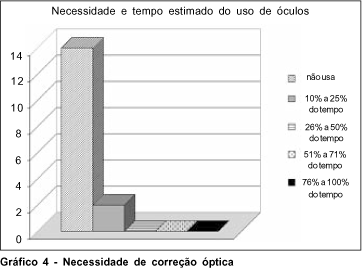 As respostas dos questionários aplicados ao grupo bilateral, cujo teor das questões envolvia a avaliação da qualidade da visão para perto (40 cm), para distância intermediária (1 m) e para longe (6 m ou mais), são apresentadas no gráfico 3. A necessidade do uso de óculos após a cirurgia, nesse grupo, foi indicada por 2 pacientes (12,5%), que usavam óculos de 10 a 25% do tempo. Um paciente requereu óculos para perto e o outro para longe (Gráfico 4).