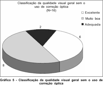 A classificação da qualidade visual geral sem o uso de correção óptica no grupo bilateral, foi considerada excelente por 6 pacientes (38%), muito boa por 8 (49%) e adequada por 2 (13%) (Gráfico 5), sendo que os mesmos responderam que realizam positivamente a maioria das tarefas e funções do cotidiano (Anexo 1- questão 6).