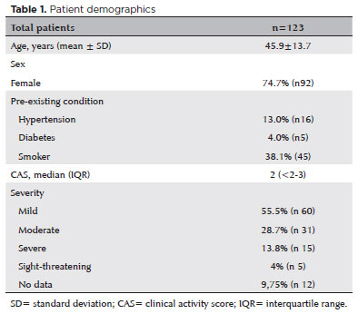 The clinical histories of 123 patients with TED who underwent treatment with PT injections between 2007 and 2019 were evaluated. Patient characteristics are summarized in table 1. The average duration of the follow-up was 6 years.