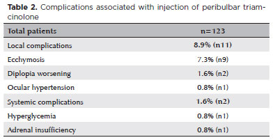 Resultados: Um total de 123 pacientes foram tratados. Apenas 11 (8,9%) pacientes apresentaram complicações locais, sendo a mais frequente a presença de equimoses palpebrais superficiais (7,3%), enquanto 2 (1,6%) pacientes apresentaram complicações sistêmicas (hiperglicemia e inibição da suprarrenal após a interrupção do tratamento). Todas estas complicações foram transitórias e nenhum paciente apresentou sequelas de longo prazo.