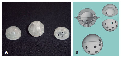 The implant was composed of two hollow hemispheres of PMMA, 12 mm in diameter and 2 mm in wall thickness, manufactured using matrices, and developed in Laboratory of the Department of Dental Materials and Prosthetics of the School of Dentistry of Ribeirão Preto, University of São Paulo. In the posterior hemisphere, 13 circular holes of 1.5-mm diameter were made manually with a perforating drill. The regularities and angulations of the holes for the formation of channels were of the same number and standardized. The anterior hemisphere had only two holes on the sides to allow the passage of a 6-0 nylon thread and fixation with the posterior hemisphere (Figure 1). The hemispheres were polished and sent for sterilization by ethylene oxide, under the responsibility of the company Oximed Tecnologia em Esterilização Ltda.