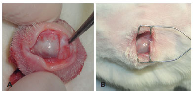 Sixteen male New Zealand rabbits weighing on average 3,000 g had their right eye eviscerated. The animals were initially sedated with 0.2% acepromazine (1 mg/kg of body weight) administered intramuscularly (IM), and then anesthetized 10 minutes later with ketamine hydrochloride (30 mg/kg IM). One drop of topical proxymetacaine and a peribulbar injection of 1 ml of 2% lidocaine hydrochloride were also instilled and performed, respectively.