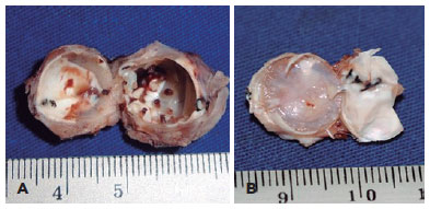 The study model allows integration because fibrovascular tissue penetrates through the channels in the posterior surface of the hollow implant, demonstrating physical integration. Tissue ingrowth into the perforations was seen in animals exenterated at 7 days PO, which is explained by the larger diameter of the holes and by 360-degree posterior sclerotomy, allowing the use of even larger implants(11). This pattern of tissue ingrowth inside the implants was similar to those in studies on integrated porous polyethylene implants(12,13). Because of the implant unperforated anterior surface, no scleral thinning was found during the study period; this distinguishes our implant from other implants whose porous material or perforated model favors scleral thinning. Another advantage was its low weight, resulting from being a hollow sphere. Lightweight implants reduce the possibility of migration and extrusion due to a lower action of gravity on weight(6,14).