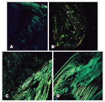 Collagen formation and maturation were analyzed qualitatively by the histochemical method of PSR staining. On microscopy with this method, collagen fibers appear red and, under polarized light by birefringence, type I collagen appears as thick yellow-orange fibers. Type III collagen, in turn, appears as thinner greenish, less compacted fibers. Collagen birefringence correlates with collagen brightness when viewed under polarized light.
