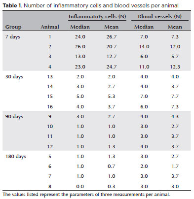 Histologic analysis noted an inflammatory infiltrate consisting of PMN neutrophils, lymphocytes, and macrophages at 7 days PO. This infiltrate progressively reduced in 30- and 90-day PO groups. Few inflammatory cells were found in 180-day PO group (Figure 4 and Table 1). No multinucleated giant cells or epithelioid cells were found in the inflammatory infiltrate.
