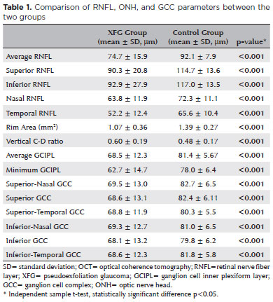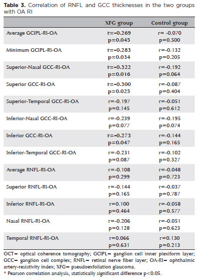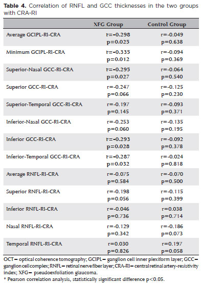 Resultados: Foram incluídos no estudo 47 casos de controle e 35 casos de glaucoma pseudoexfoliativo. No grupo com glaucoma pseudoexfoliativo, a média da camada de fibras nervosas da retina peripapilar e a espessura do complexo de células ganglionares foram menores em todos os quadrantes em comparação com os controles, com significância estatística (p<0,001). Os valores do índice de resistividade das artérias oftálmica e central da retina foram significativamente maiores no grupo com glaucoma pseudoexfoliativo que nos controles (p<0,001 e r=0,684). Ao se compararem os valores do índice de resistividade das artérias oftálmica e central da retina com a espessura do complexo de células ganglionares, foi encontrada uma correlação significativa entre elas. Por outro lado, não detectamos uma relação significativa para a espessura da camada de fibras nervosas da retina.