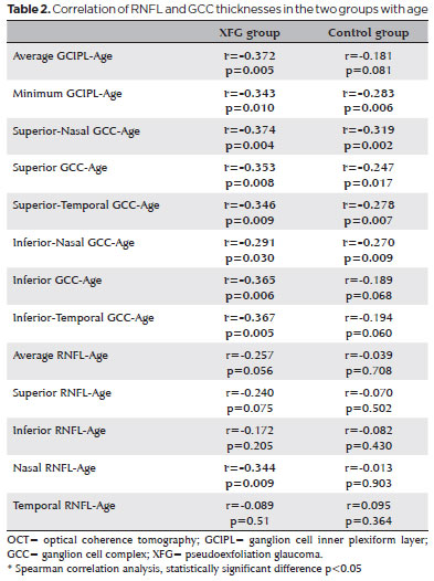 GCC and RNFL thickness values were statistically lower in all quadrants in XFG group than in control group (p<0.001) (Table 1). In both groups, a statistically significant negative correlation was found between age and GCC (Table 2). When the relationship of RNFL thickness with age was examined, no statistically significant relationship was found in control group. However, in XFG group, there was a weak negative correlation with age only in nasal quadrant thickness (r=-0.344 and p=0.009). No statistically significant correlations were observed regarding the relationship between age, rim area, and vertical C/D ratios in both groups.