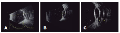During the patient’s ultrasound, we observed the presence of a moderate-sized echolucent fluid reservoir, which is indicative of GDD patency(7). We did not observe, however, any flattening of the sclera as this is common only with larger blebs(7).