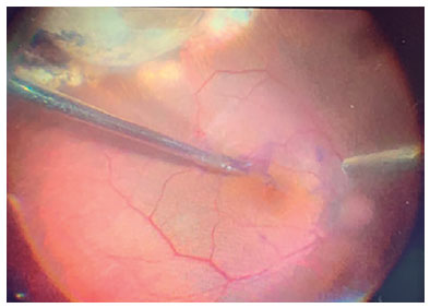 After ruling out a diagnosis of melanoma, we performed a new PPV to remove the epiretinal membrane, internal limiting membrane, and dexamethasone implant as shown in Figure 3.