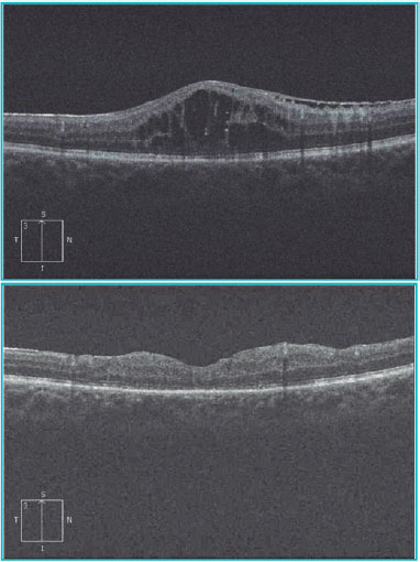The patient was stable, his legion remained unchanged, and his IOP was controlled after surgery. The patient’s visual acuity improved to 20/70 (0.54 logMAR), and we determined that his low visual acuity was caused by the epiretinal membrane and not by the fistula. Figure 4 shows the OCT pre- and postsurgical treatment.