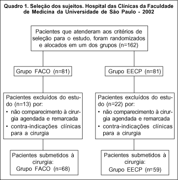 O quadro 1 mostra o fluxo da seleção dos pacientes para inclusão no estudo e composição dos grupos.